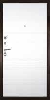 Снаружи дверь металлическая, с нанесённым порошковым напылением цвета медный антик, стойким к механическим воздействиям и, как следствие, долговечным. На торце двери расположен объёмный хромированный логотип компании.