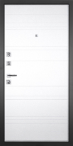Снаружи дверь имеет красивую внешнюю декоративную панель тёмно-серого цвета, которую эстетично дополняют МДФ-наличники в тон панели. Объёмный хромированный логотип компании гармонично вписан на торце полотна и защищает от подделок.