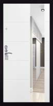 Снаружи дверь имеет элегантную внешнюю декоративную панель чёрного цвета, которая идеально сочетается с порошковым покрытием металла чёрный муар. Объёмный хромированный логотип компании гармонично вписан на торце полотна и защищает от подделок.